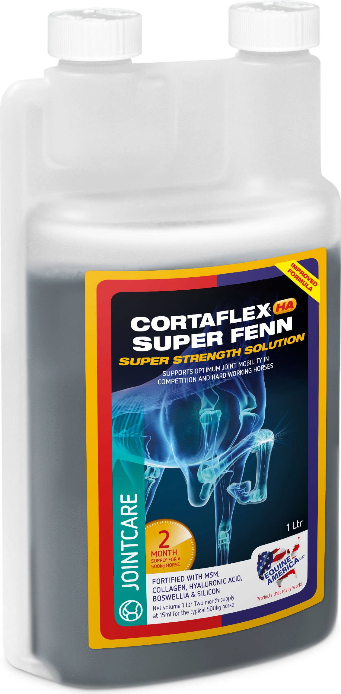 Cortaflex® HA Super Fenn Solution has been specifically formulated for horses in intensive training, racing or competition. During these phases, joints are exposed to significant stress, and this liquid supplement provides targeted nutritional building blocks. The formula combines ethically sourced marine collagen with a high concentration of hyaluronic acid to support the properties of synovial fluid and maintain healthy cartilage structure. Amino acids and key trace elements such as manganese, silicon and copper contribute to the formation of the body’s own connective tissue components.