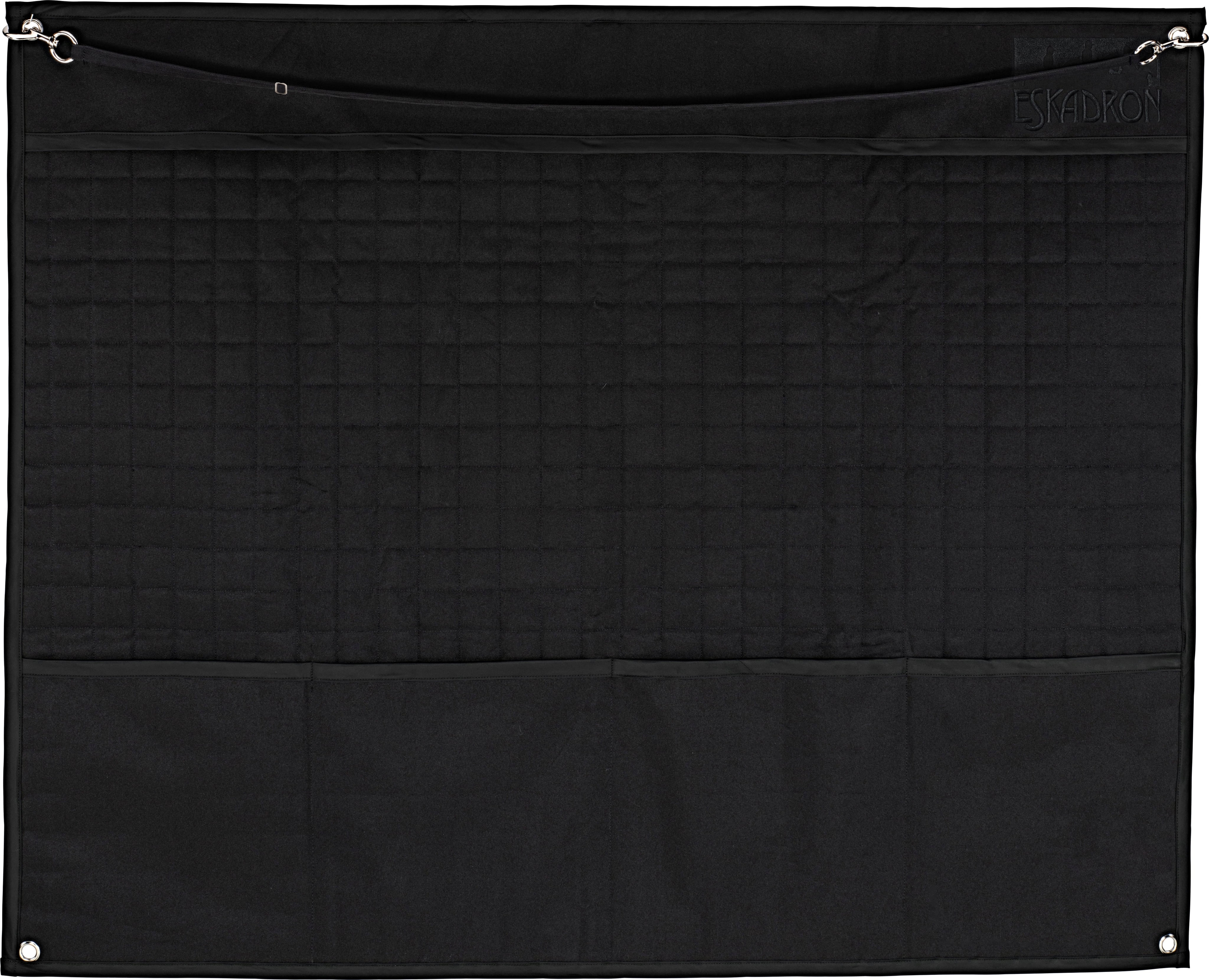 This stall curtain festures a classic quilted material with shiny edging and practical slit pockets. Hooks and straps allow you to hang up halters and bridles.