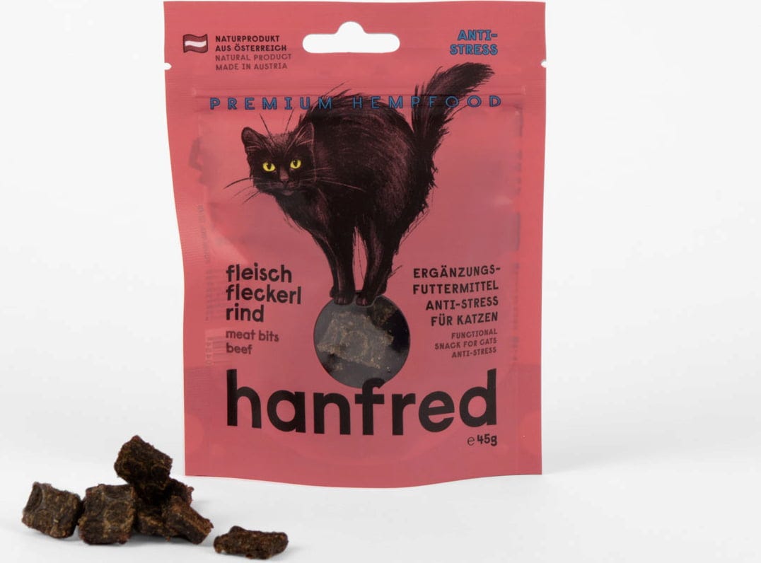 If your cat is sensitive to changes or stressful situations, this snack could be a good choice. Hanfred Meat Bites are made with 95% meat and 5% hemp powder – completely free from grain and artificial additives.