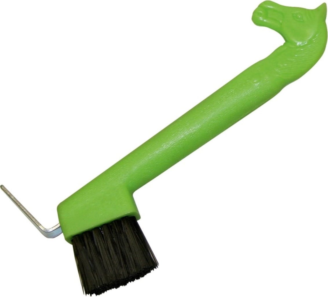 A robust plastic hoof pick with a cleaning brush and decorative horse's head on the handle.