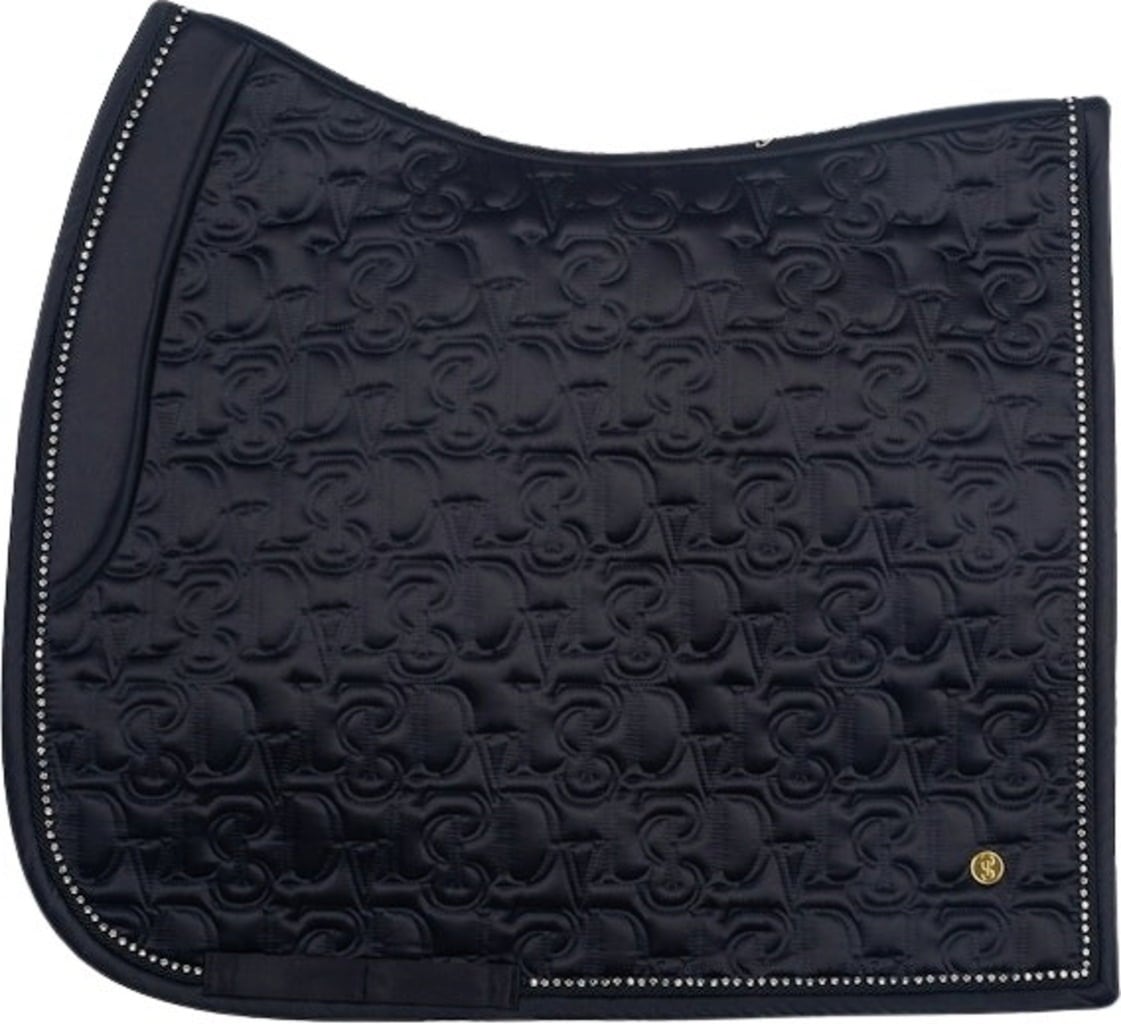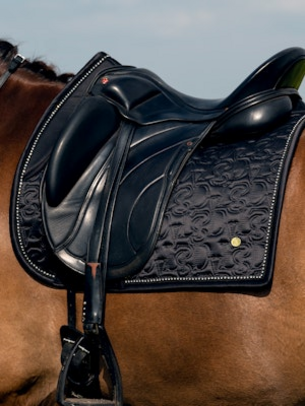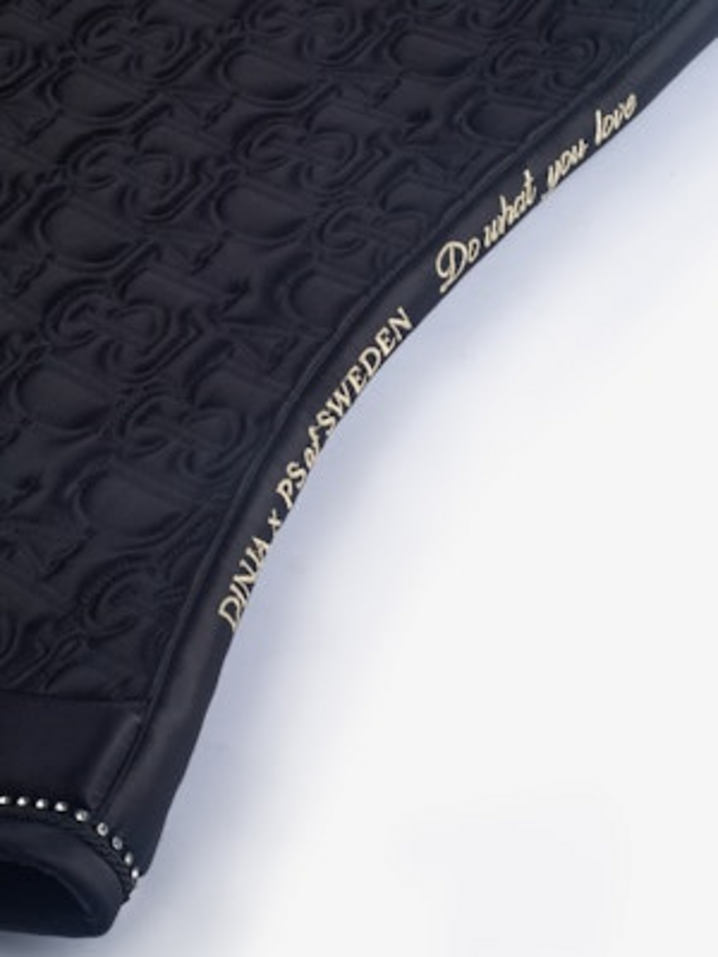 The Dinja x PS Dressage Saddle Pad is a limited edition saddle pad that masterfully blends luxurious design with top-tier functionality. Anatomically shaped with added space at the withers, it allows for optimal freedom of movement. Signature PS quilting, a satin Dinja x PS logo pattern, golden logo accents, and crystals along the white trim add a sophisticated touch—ideal for a striking look in the dressage arena.