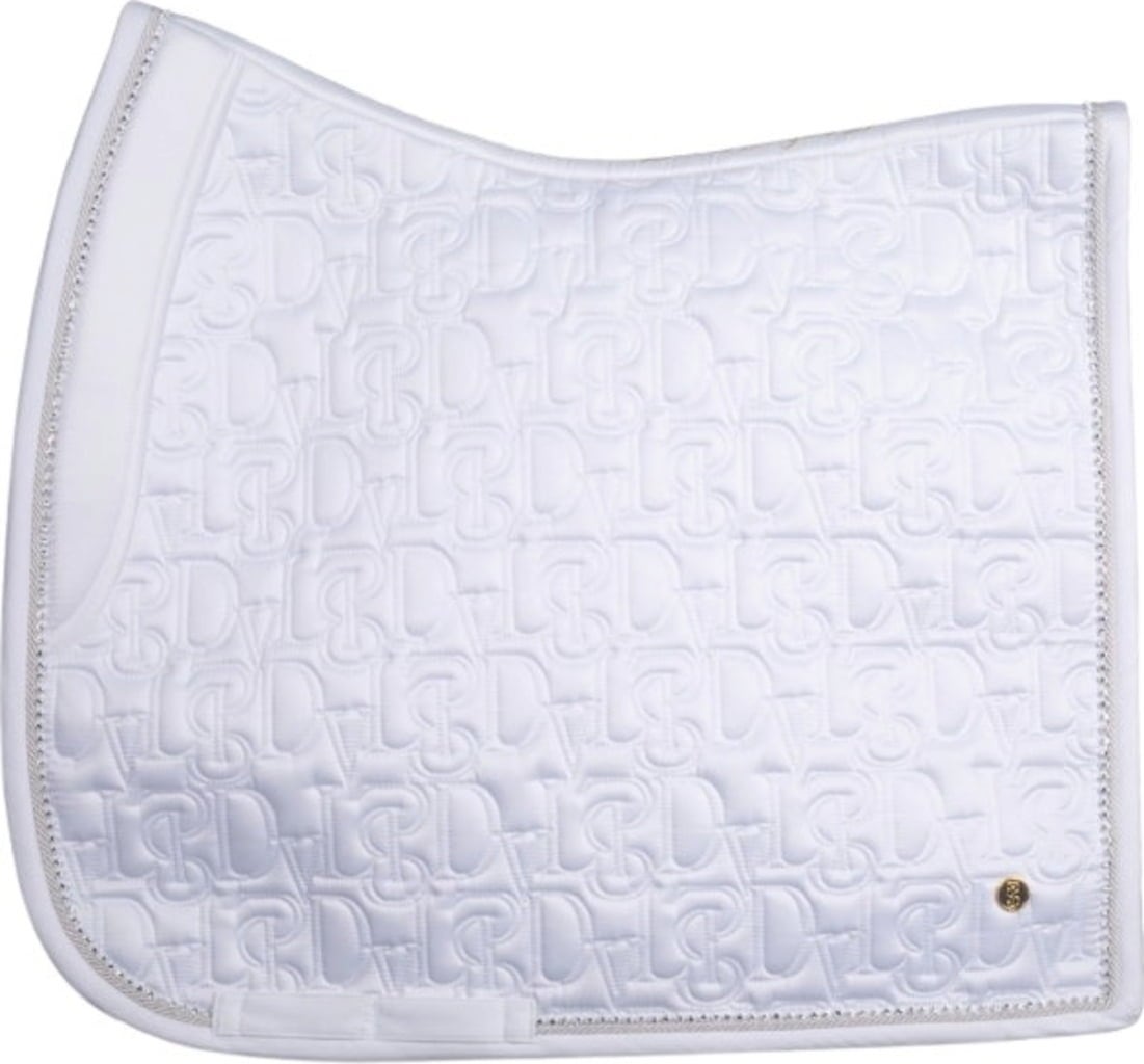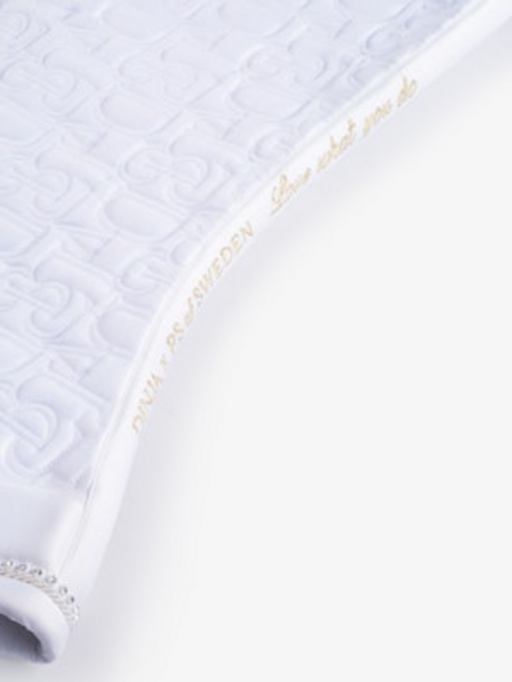 The Dinja x PS Dressage Saddle Pad is a limited edition saddle pad that masterfully blends luxurious design with top-tier functionality. Anatomically shaped with added space at the withers, it allows for optimal freedom of movement. Signature PS quilting, a satin Dinja x PS logo pattern, golden logo accents, and crystals along the white trim add a sophisticated touch—ideal for a striking look in the dressage arena.