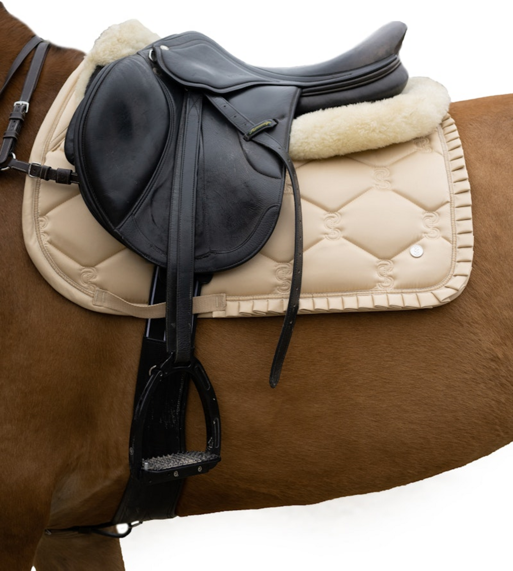 One of its standout features is the elegant ruffle trim, giving the pad a distinctive and refined appearance. The ultra-quick-drying lining efficiently wicks away sweat and moisture, so the pad is ready to use again in no time. Finishing touches include the iconic PS quote along the spine, embroidered girth straps with the brand logo, and a subtle metal brand emblem on the side.