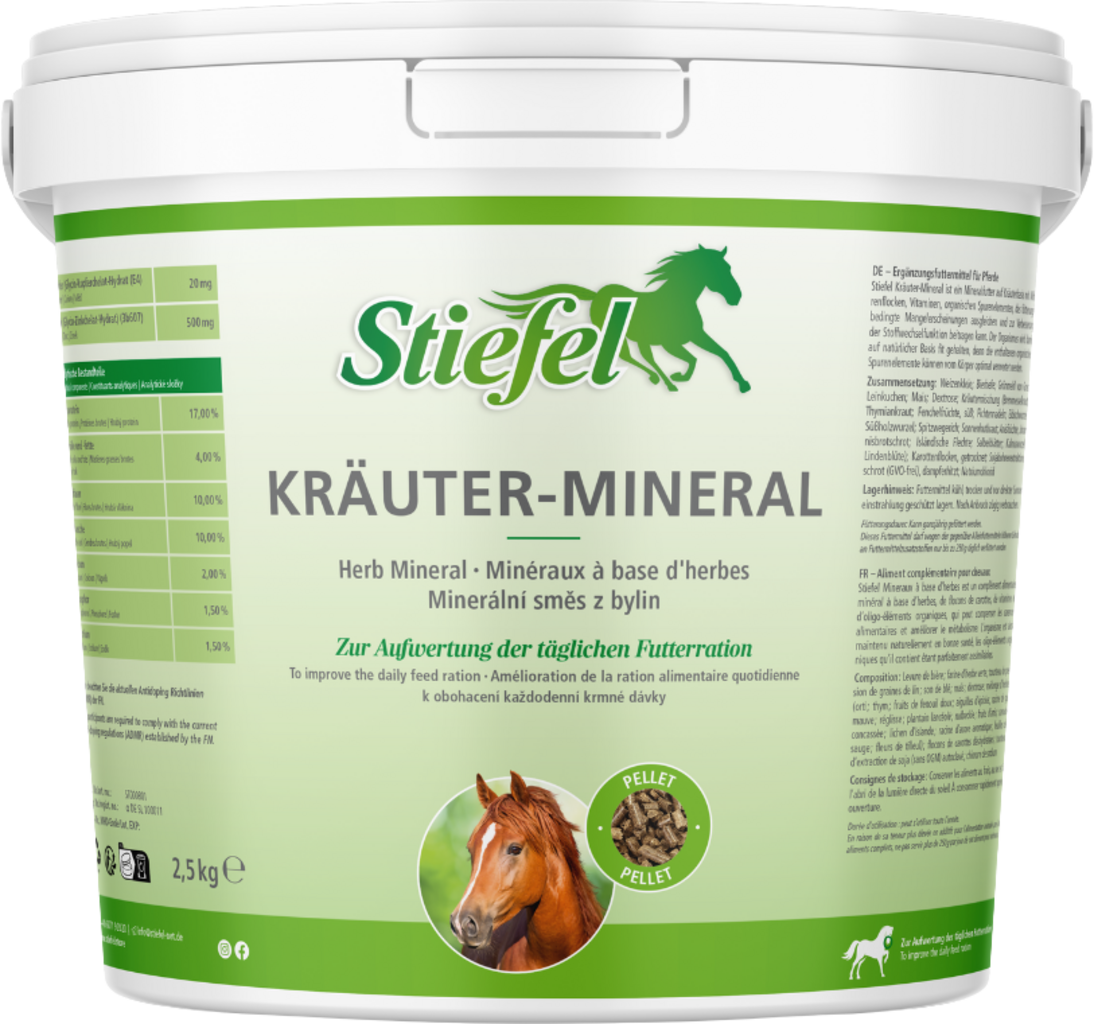 Stiefel Herb Mineral is a mineral feed based on herbs with carrot flakes, vitamins and organic trace elements, which can compensate for feed-related deficiencies and help improve metabolic function. It keeps the body fit in a natural way, as the organic trace elements it contains can be optimally utilised by the body.