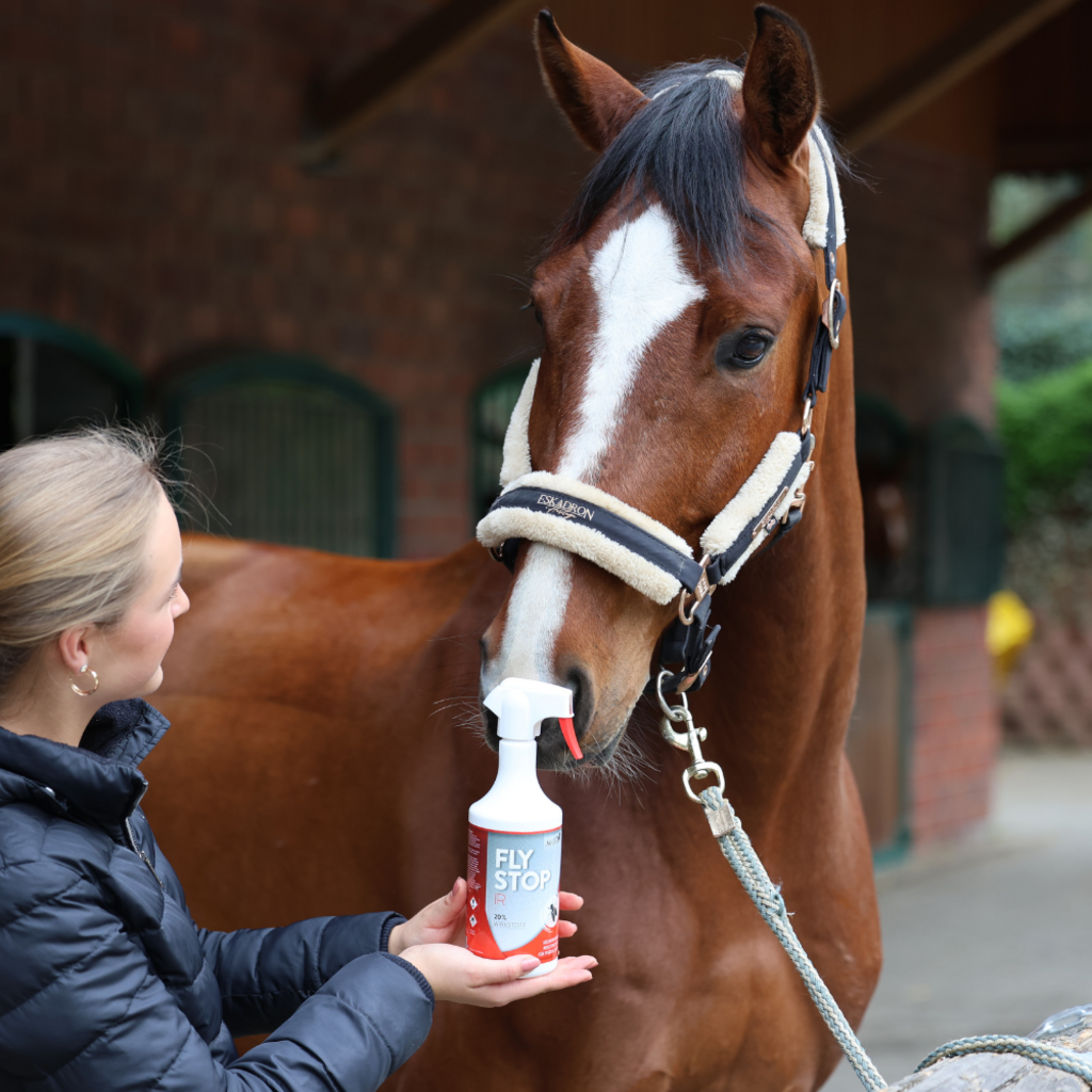Stiefel FlyStop IR is the new active insect repellent by Stiefel in compliance with Biocidal Product Regulations. It contains the active ingredient EBAAP, which has a long-lasting effect against black flies, ticks and flies. The active ingredient provides effective protection for many hours and has a mild odour so that neither horse nor rider are bothered by an unpleasant smell. The active ingredient is also very well tolerated by the skin, making it suitable for sensitive horses and riders. For optimum effectiveness, Stiefel FlyStop IR should be sprayed over the entire surface of the horse. The volatile properties of the active ingredient create a thin, protective scent that can last for several hours.