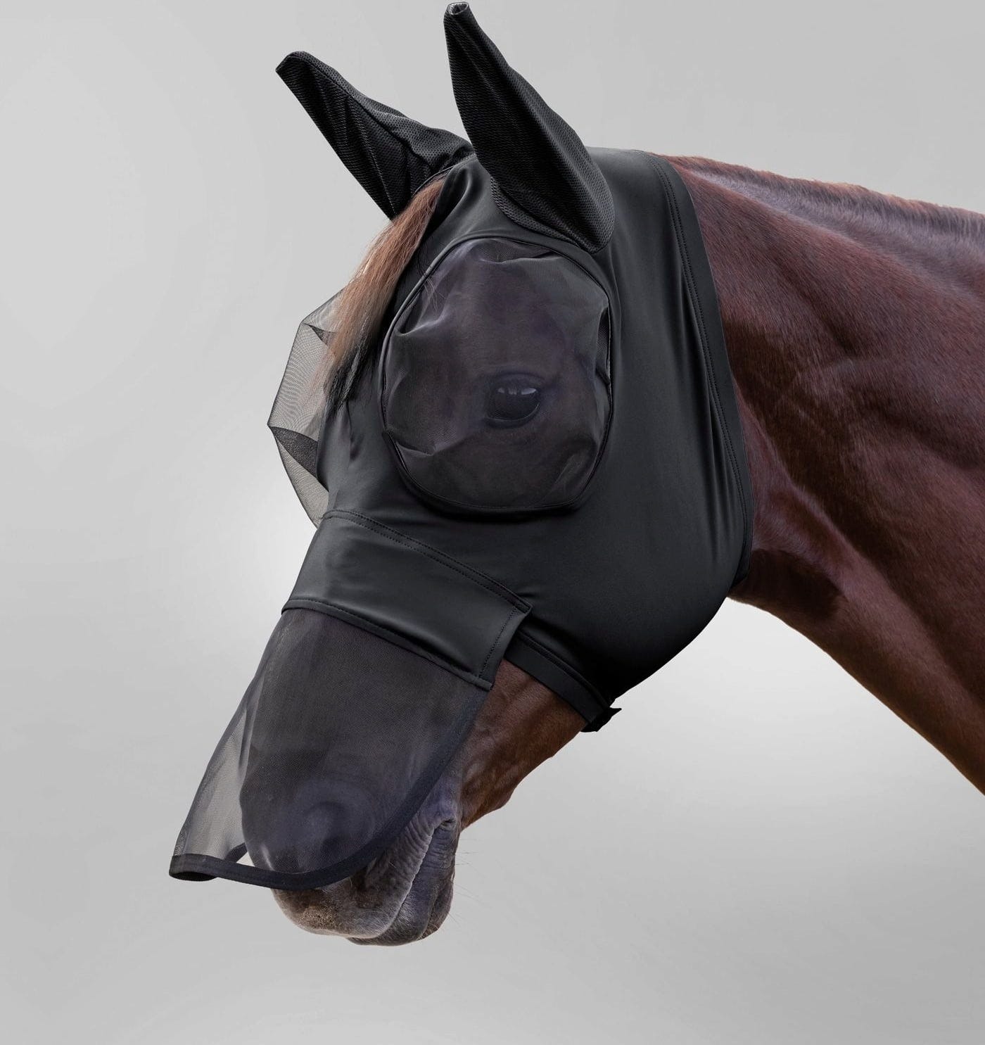 All edges of the mask feature soft fleece padding, effectively preventing friction and ensuring a gentle fit against the skin. The breathable ear sections provide extra protection against midges while preventing heat build-up. Thanks to the wide hook-and-loop fastener, the mask is easy to adjust to the horse's head and remains secure and stable even during movement in the paddock. A functional all-rounder for anyone seeking an uncomplicated solution with full face protection.